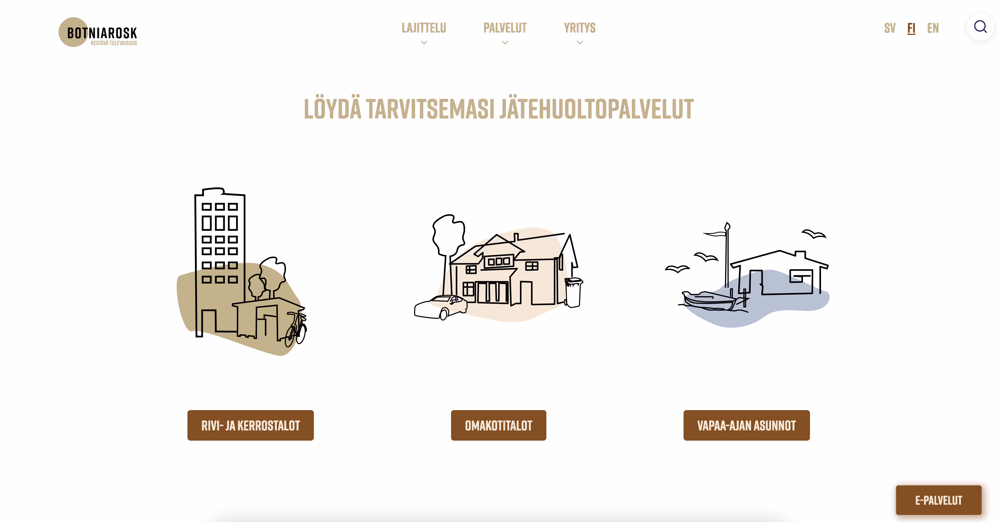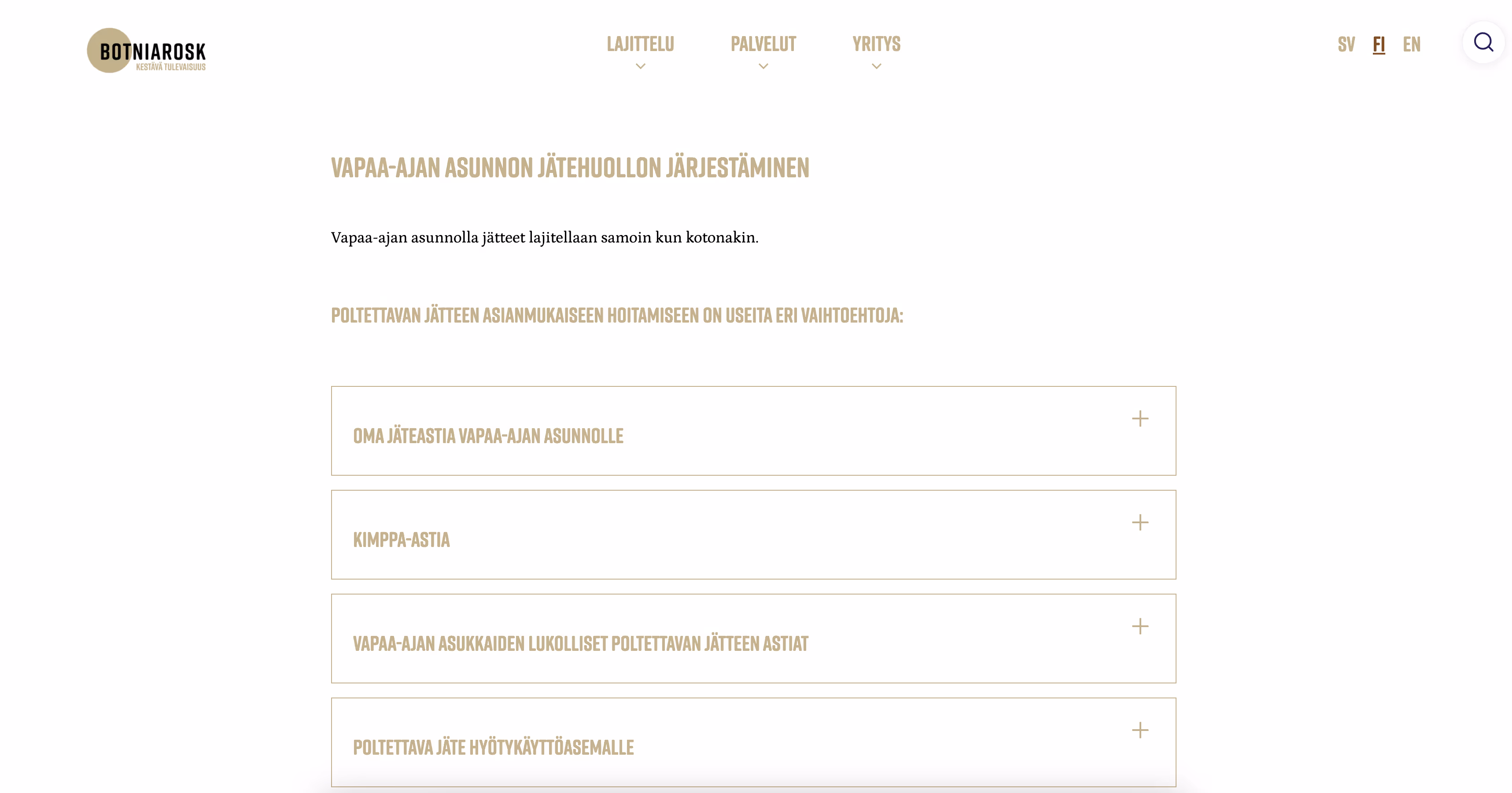 The Botniarosk Waste Management Website is a dynamic and user-friendly platform designed to facilitate efficient waste management in the Ostrobothnia and South Ostrobothnia regions of Finland. Owned by seven municipalities - Isojoki, Karijoki, Kaskinen, Kauhajoki, Kristiinankaupunki, Närpes, and Teuva