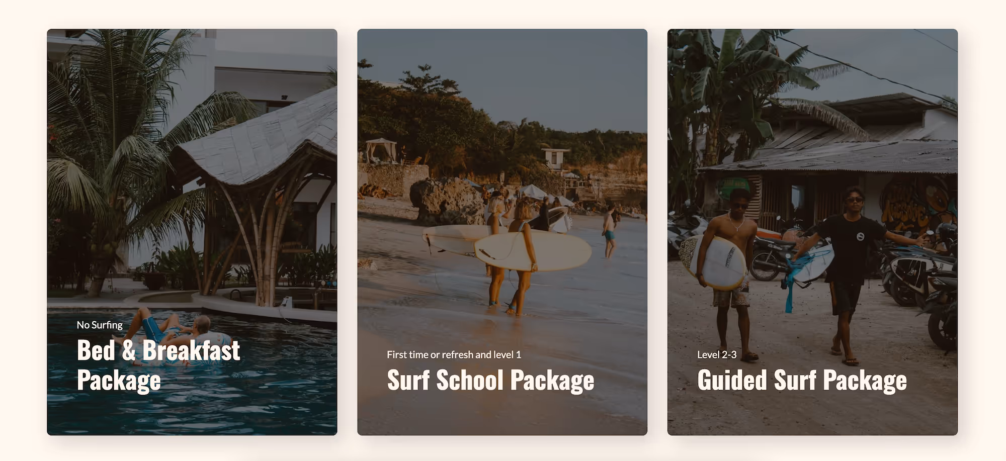 Our team started by redesigning the website with a mobile-first approach. Knowing that many users access the site on the go, we ensured the platform was intuitive, fast, and easy to navigate—whether users are booking surf lessons or exploring accommodation options. Every visual element, from the color palette to the layout, was tailored to capture the energy of Bali’s surfing culture while maintaining a professional feel.